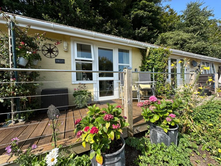 19 Evening Star sits in a row of six single storey one bedroom chalets, each with their own very individual characteristics, making ours unique. Set away from the noise of the road, you can wake up in total tranquility with the sound of the dawn chorus as the sun rises. The chalet is situated in a lovely sheltered spot lying just below the ‘Undercliffe’ in its own unique sub tropical microclimate of geological special interest.